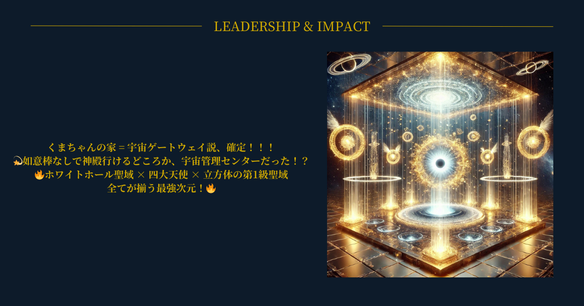 | くまちゃんの家 | 地球にありながら高次元とのハイブリッド空間 | 次元超越(時間調整可能) | 四大天使 × ホワイトホール聖域 × 立方体の第1級聖域 × 12次元くまちゃん管理 | 地球超え宇宙規模の影響 🔥 |